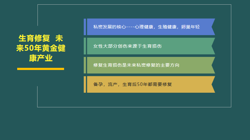 高龄化三胎生育会促使更大一批女性加入产后保养的大军中,更加科学全面,深入,彻底的修复会让产康迎来新一轮的生育经济复兴,经年损伤顾客痛点更加强烈,专业的生育修复体系是现在最强有力的竞争,产后修复不再是毕业班